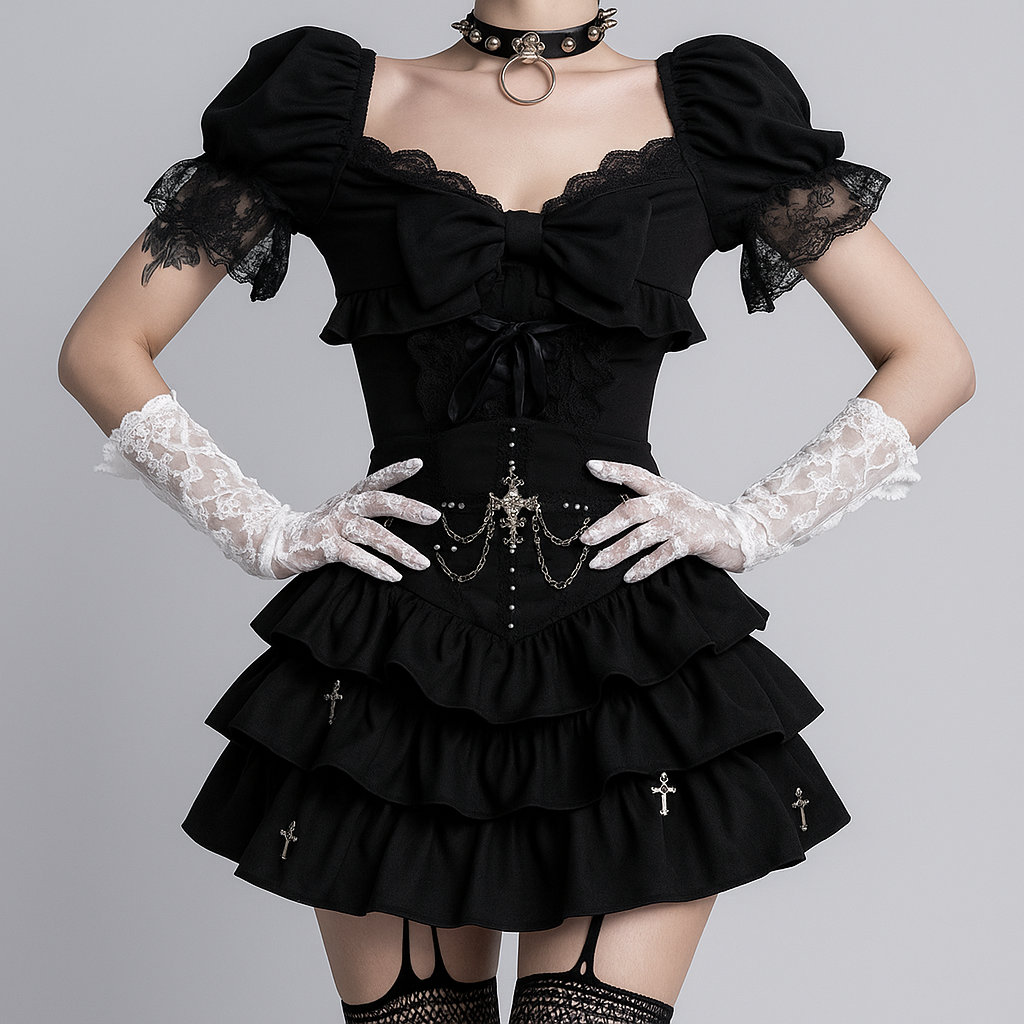 GOTHIC BLACK PLEATED MINI SKIRT – DARK CROSS ACCENT SUMMER LOOK.