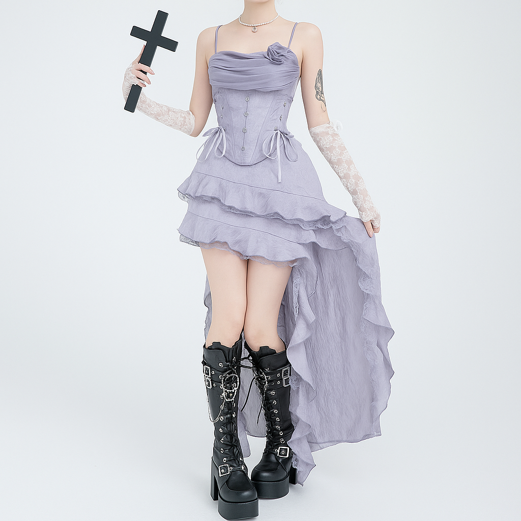 - Flowy, layered ruffles enhance the gothic aesthetic.