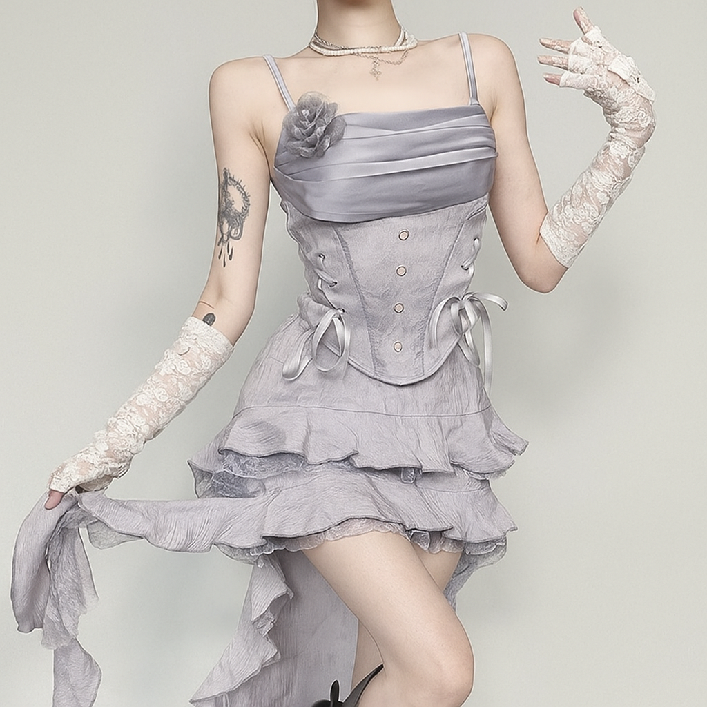 Silver Gray Gothic Floral Asymmetrical Skirt Set