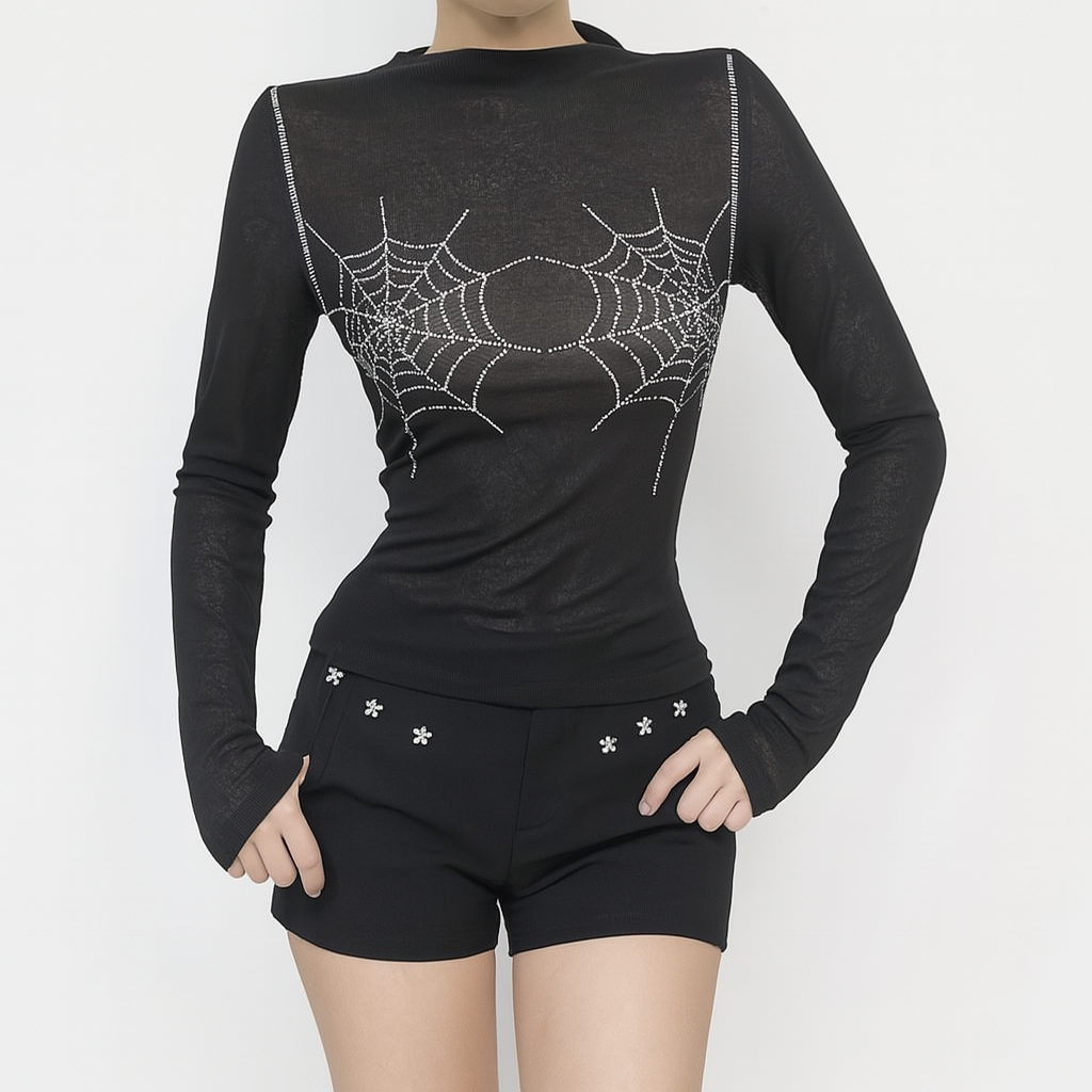 - Features striking 3D spider web design with dazzling rhinestone accents.