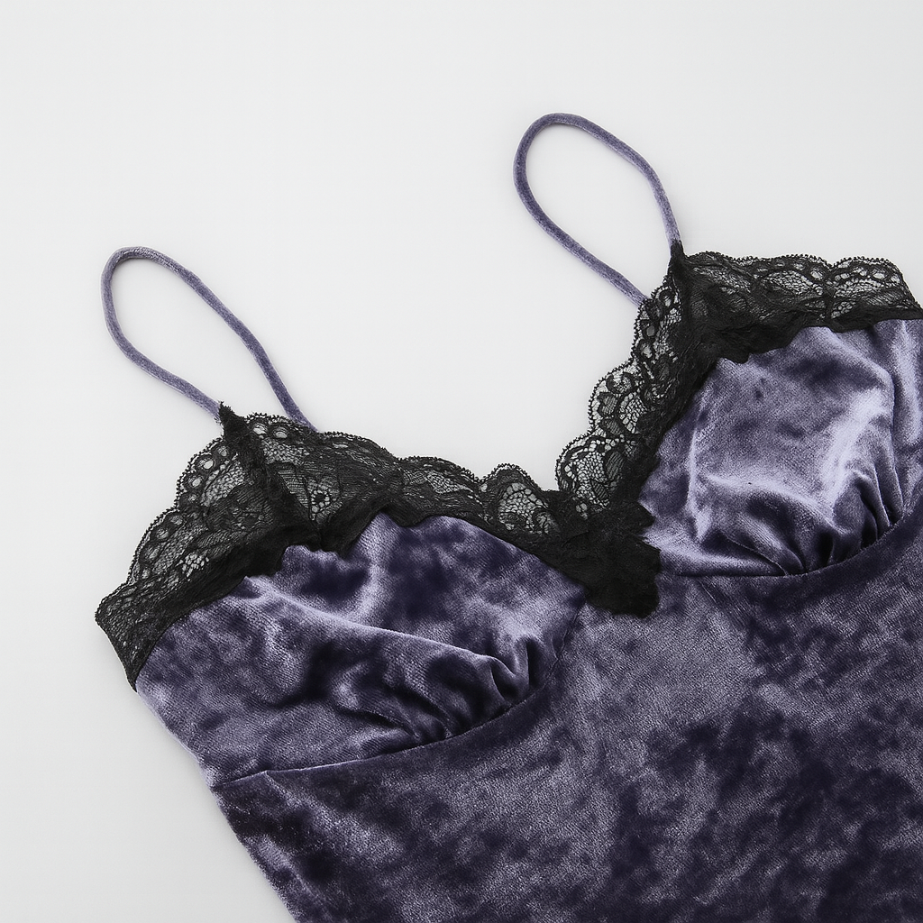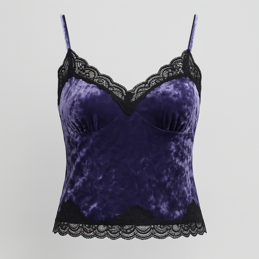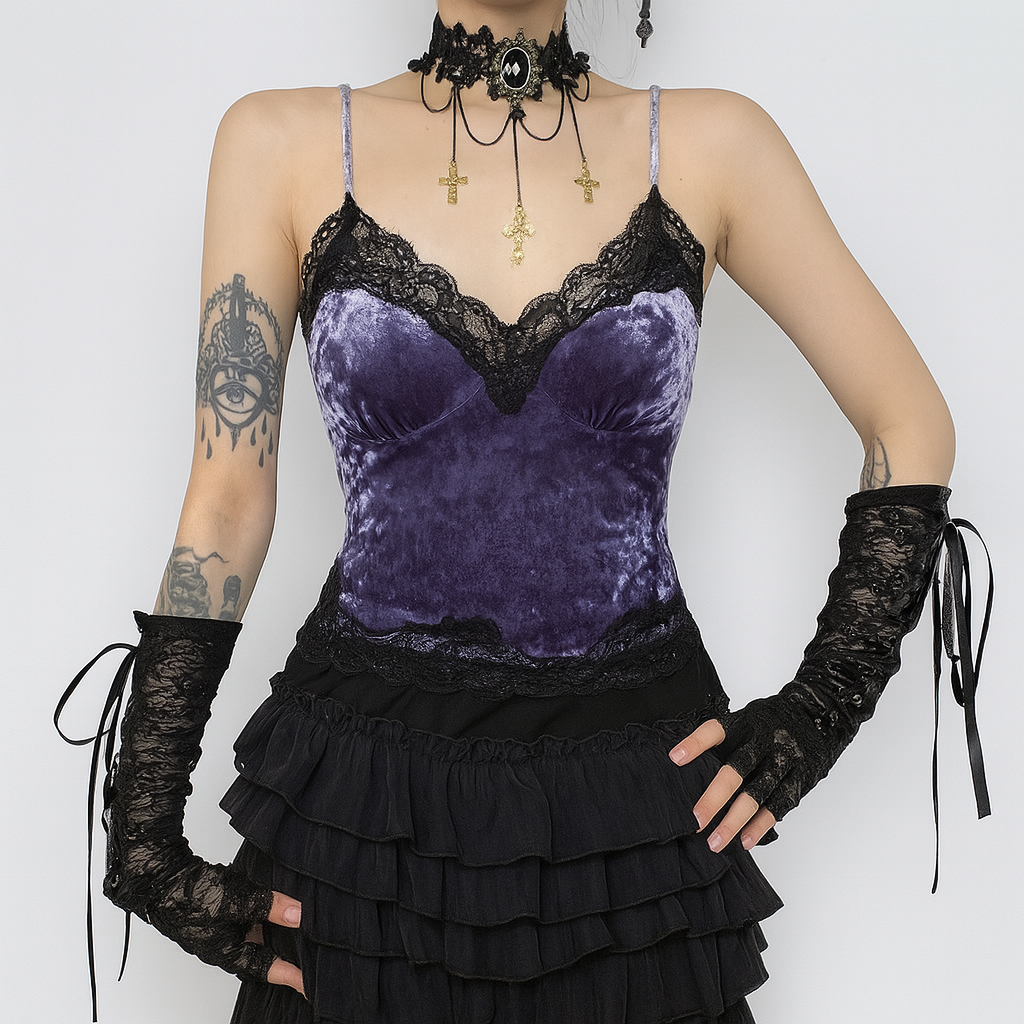 VELVET VIXEN – GOTHIC LACE VELVET STRAP TOP.