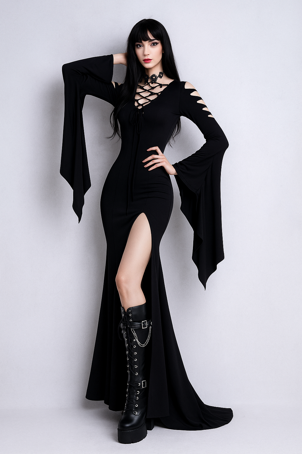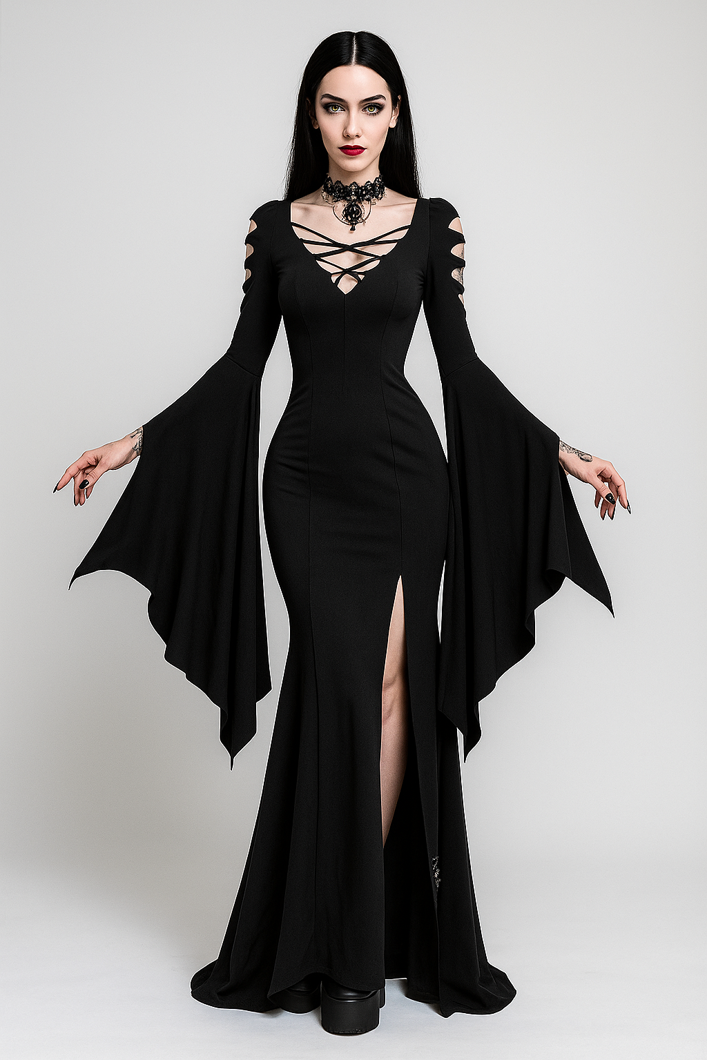 WITCHVEIL MAXI – GOTHIC V-NECK BAT SLEEVE DRESS.